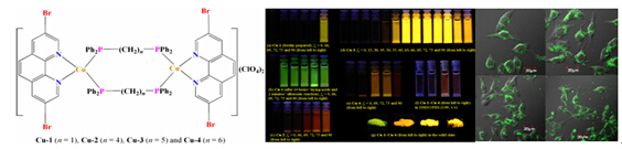 研究生辛雪莲和艾玉波合成了一系列具有良好磷光发光性能以及具有不同金属环构型的双核环状Cu(I)-二亚胺-膦化合物,并探讨了这些化合物在不同浓度的溶液中以及在不同碰撞能量下的解离行为,从而得出[Cu2(Ph2P(CH2)nPPh2)2] (ClO4)2在溶液中是热力学稳定的产物,而 Cu2(BrphenBr)2(Ph2P(CH2)nPPh2)2](ClO4)2 是结晶动力学稳定的产物,并从晶体学上探讨了影响后者稳定性的因素。该系列配合物呈现出良好的聚集诱导磷光性能,其聚集诱导磷光性能成功地用于活细胞成像。该研究成果发表在Inorg. Chem., 2014, 53, 2922-2931. 链接:http://pubs.acs.org/doi/pdfplus/10.1021/ic402685u