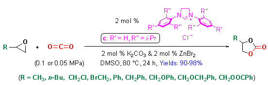 l Xiang Liu, Changsheng Cao,* Yunfei Li, Pei Guan, Longguang Yang, Yanhui Shi*, Cycloaddition of CO2 to Epoxides Catalyzed by N-Heterocyclic Carbene (NHC)/ZnBr2 System under Mild Conditions, Synlett, 2012, 23, 1343-1348.