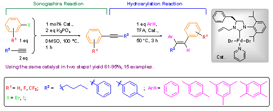 Sonogashira反应是关于末端炔烃与芳基卤化物偶联形成双取代炔烃化合物的方法,此反应在通常情况下都需要CuI和磷配体的存在,并用Pd有机化合物在惰性气氛下来催化进行。由于我们所制备的NHC-Pd化合物活性高,其对空气、水稳定,因而在催化此类反应时,不需要加入CuI和磷配体,且是在空气条件下进行的。尤其是,NHC-Pd化合物还可以在同一体系中继续催化上一步生成炔烃的芳氢化(hydroarylation)反应,最终得到了结构均为反式烯烃的化合物。