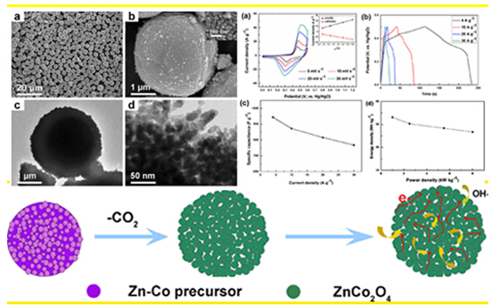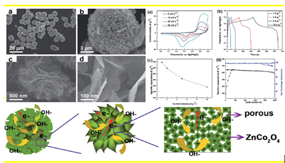 Abstract: Hierarchical porous ZnCo2O4 microspheres have been successfully synthesized via a solvothermal method followed by an annealing process. The ZnCo2O4 electrode shows a high specific capacitance of 647.1 F g-1 at 1 A g-1 and 440.6 F g-1 at 10 A g-1 in 2 M KOH.